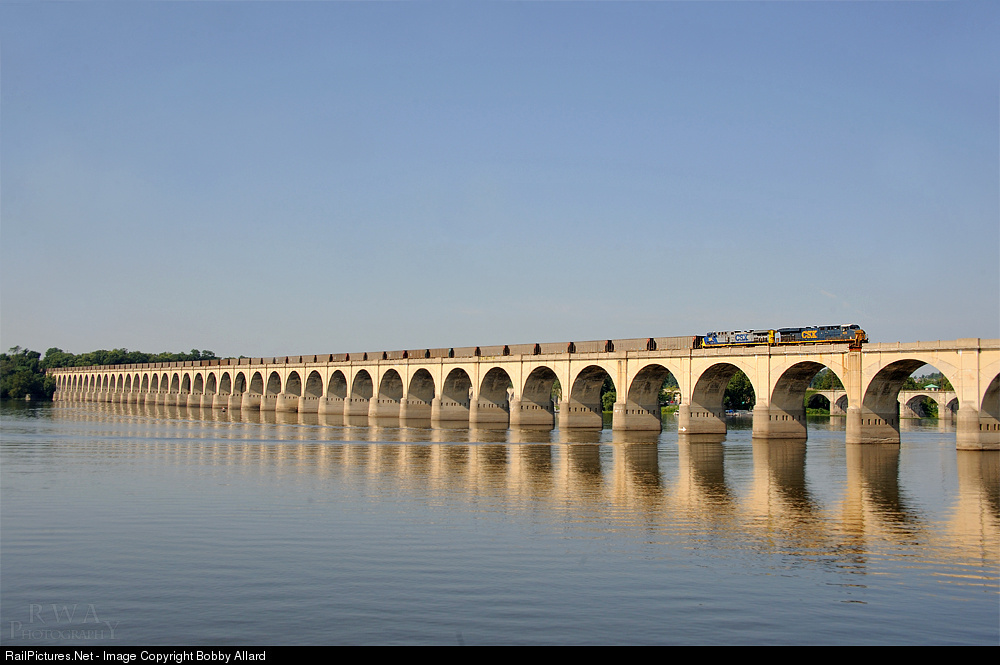 An extra Shire Oaks empty coal train with CSX power waits over the Susquehanna while an NS intermodal starts it's journey west on a pleasant Summer morning. Although it looks a bit menacing, the Susquehanna River is only a few feet deep in this area.