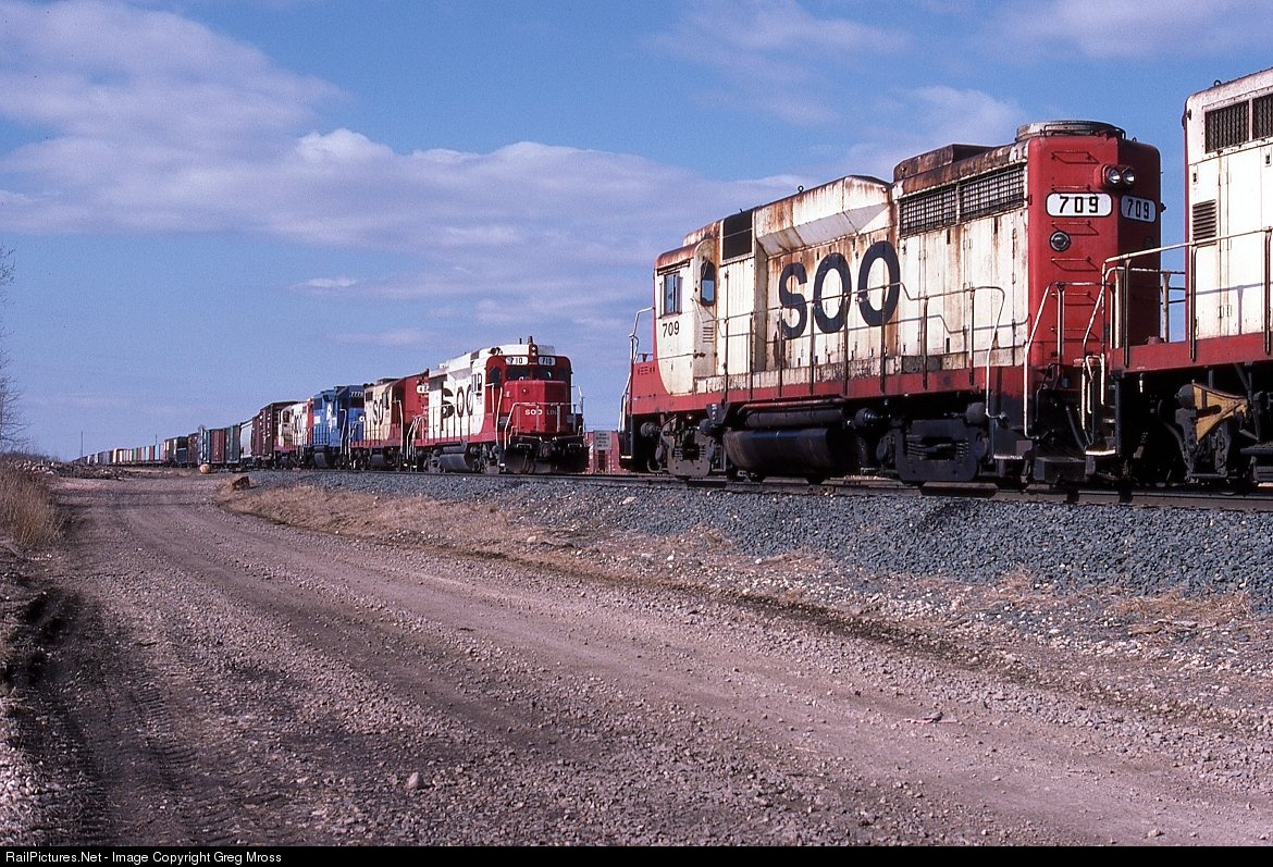 It may look like the Soo Line, but it is actually Lake States RR, the short lived subsidiary before purchase by the WC. Here a northbound awaits a southbound at Shops Yard, both trains powered by GP30's with Alco trucks.