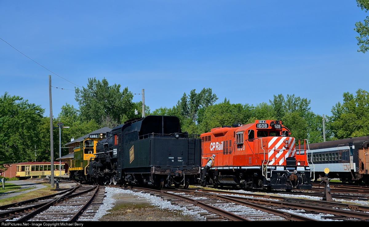 | Switching a steam engine. With GP9 CP 1608 watching at right, SW1200RSm CN 1382 switches 4-6-2 CN 5550 in the yard in Exporail, with the Hays Station in the background and a streetcar passing the station. |
