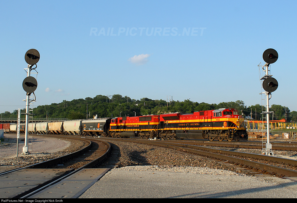 | KCS 4193 is in charge of KCS's daily Q-train from Kansas City to Nuevo Laredo, Mexico rolling down the terminal in Kansas City. Due to a bridge outage in south Texas the train is taking an unusual route around town to detour via the UP south to Texas. |