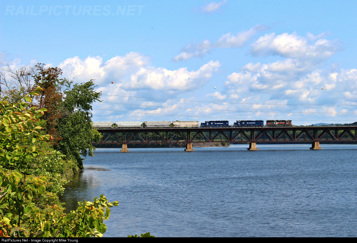 On of the last few remaining high hood GP40s in Guilford paint leads train RJED across the Hudson River Bridge on their way East.