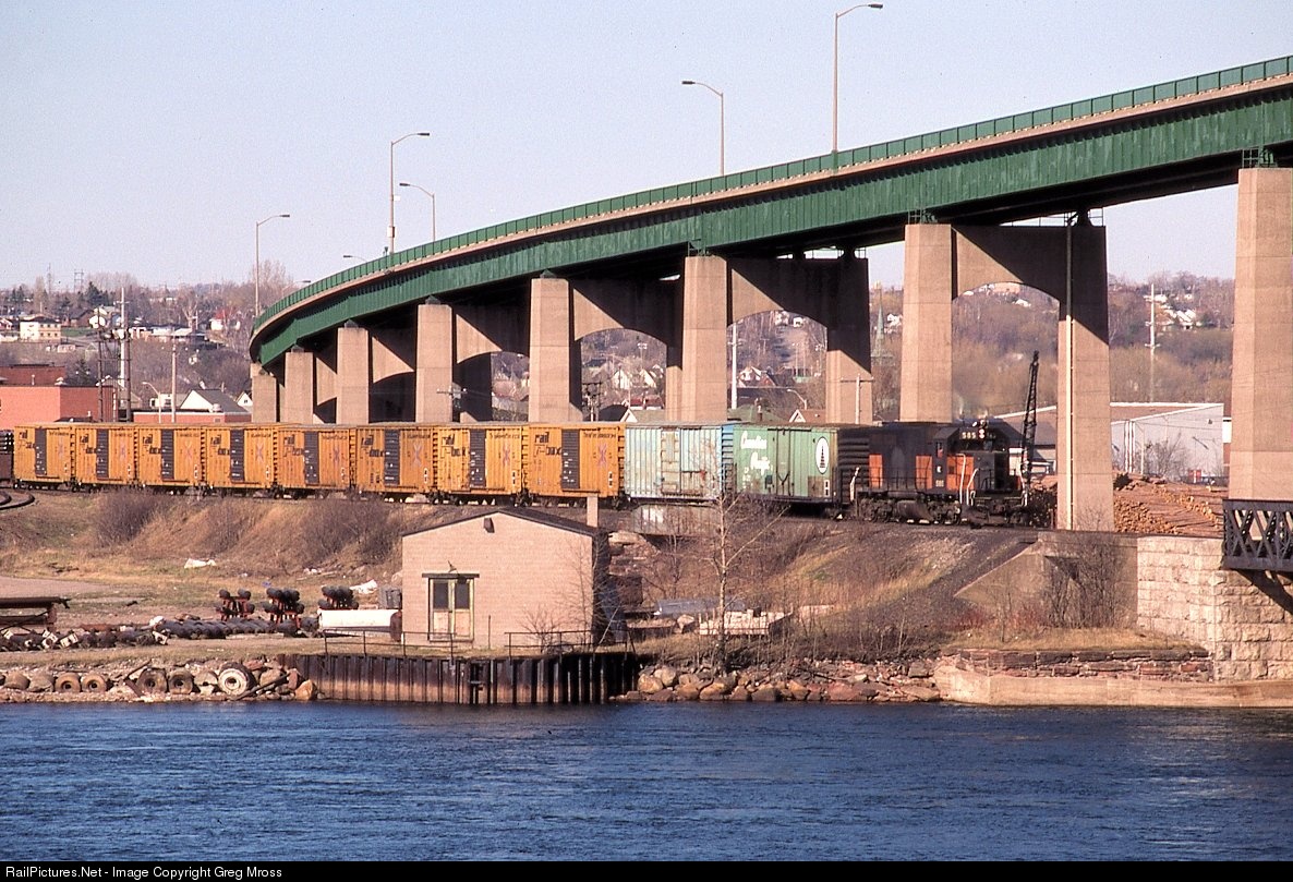 WC 585 is about to depart Canada for the USA as it crosses the Saint Mary's River in May of 1988. The International Bridge is in the background. That bridge is quite busy on Friday evenings as Canadians head to the USA to fill up with cheap gas!