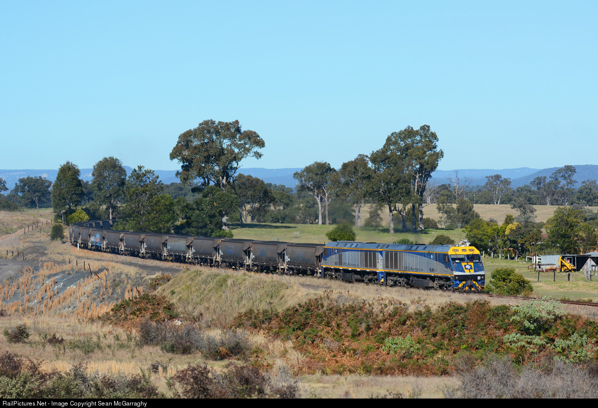 | Leased locomotives EL64 & EL57 from CFCLA to Pacific National combine to work a loaded Pelton coal train, AS936 to Kooragang Island. This service is now down to one fleet that runs two return trips between the port and Pelton colliery. |