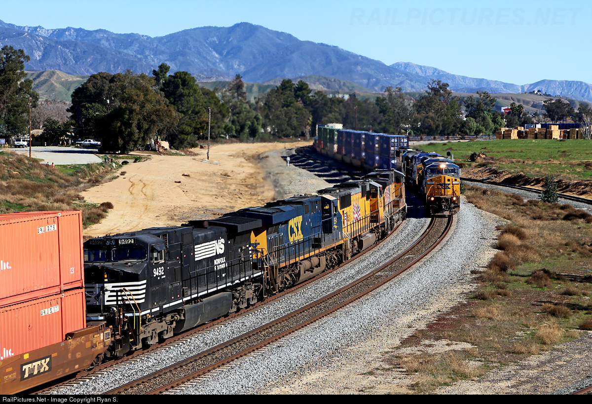 | Pool is cool! Road power from three class 1s come together as a pair of Union Pacific Z trains meet in Beaumont, CA. Trailing CSX and Norfolk Southern motors trail the head-end consist on the eastbound ZLCAI while the westbound ZATLC has drawn a solid set of CSX motors, led by a former Conrail C40-8W. |