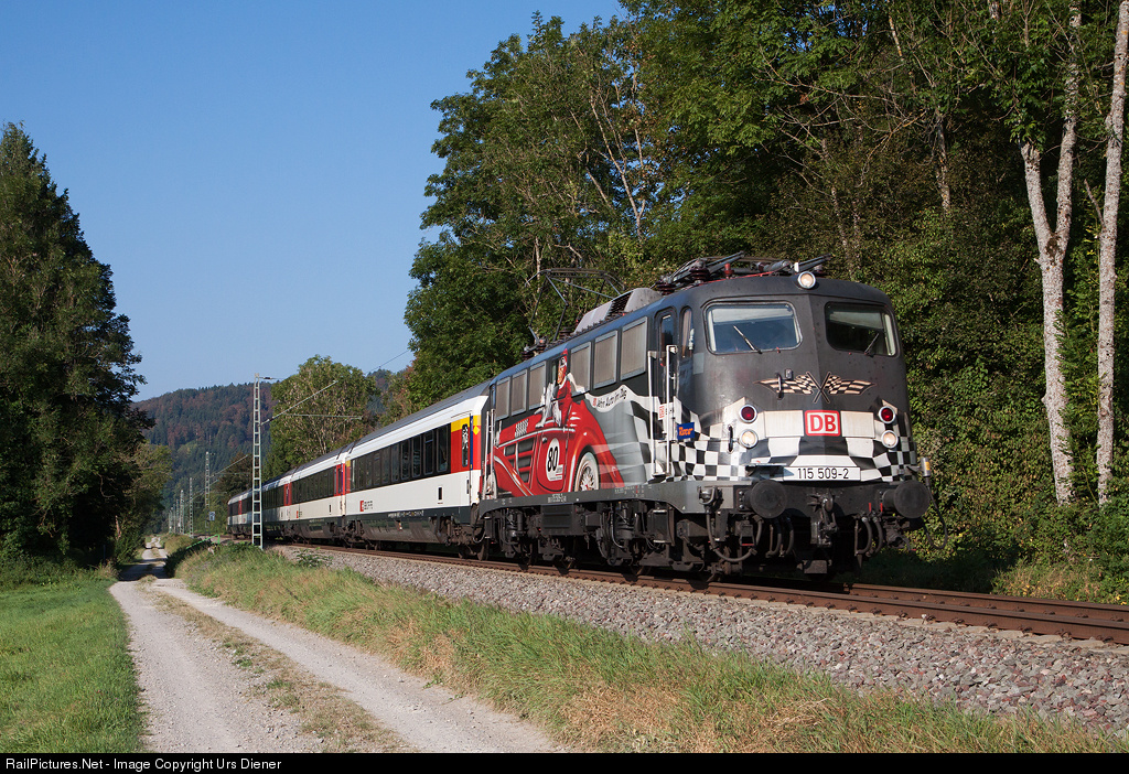 | The classic "Einheits-Lokomotive" (standardised electric locomotives) 115 509, wearing the "80 years of DB AutoZug" paint scheme, is pulling IC 284 from Zürich (Switzerland) to Stuttgart (Germany). |