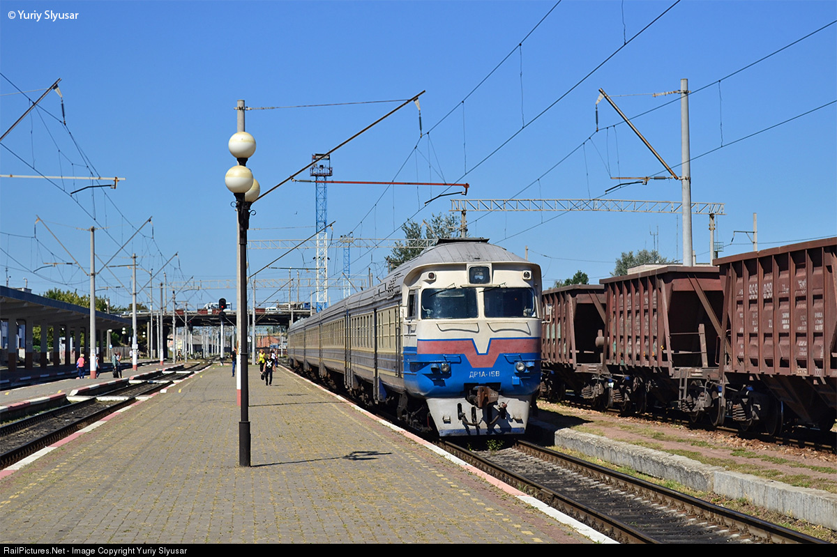 The DMU set DR1A-156 waiting for depart on route #878 Zhytomyr - Korosten'. This regional train was departing from Zhytomyr station at 12:56 and arrived to Korosten' station at 14:28. This DMU was built by RVR (Rīgas vagonbūves rūpnīca) in 1978, and this DMU was registred to depot RPCH-10 Chernigiv. All diesel multiple unit of Pivdenno-Zakhidna zaliznytsya (South-Western Railway) was registed to depot RPCH-10 Chernigiv, but they was serving non