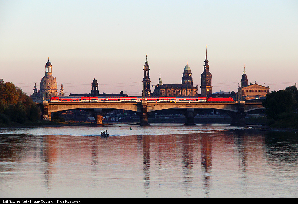 | S 31760 Schöna - Meißen Triebischtal. Dresden Elbe bridge / Marienbrücke 472 m in the light of the setting sun. In the background the towers of Frauenkirche, Ständehaus, Hofkirche and building of Semperoper. |