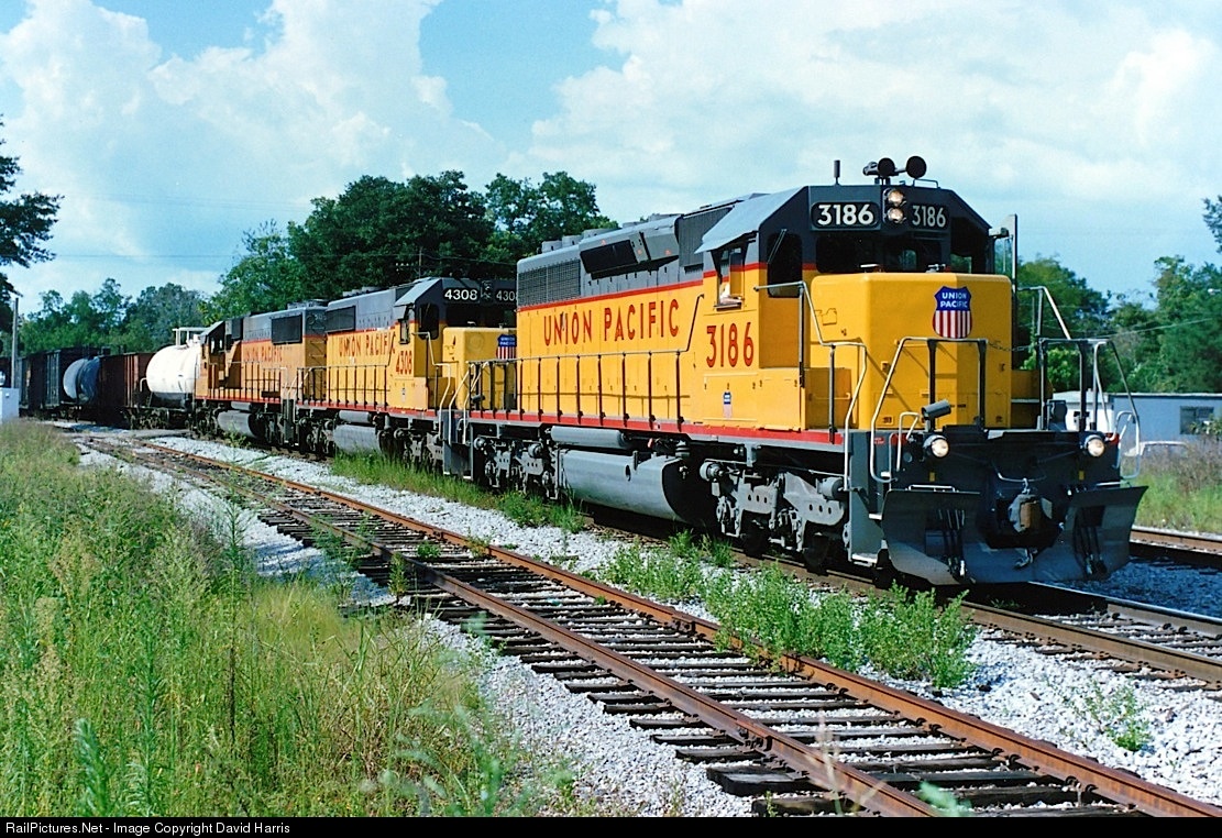 This train has just 'taken a right' to head for Pensacola, FL, but most of it is still on the old L&N's NOLA-Cincy main stem back around the curve. Power may look boring, but there is a bit of variety under the yellow paint. Lead unit 3186 (7/72) is UP all the way, but trailing units are ex-MP, with a db-less SD40-2 4308 (delivered in blue as 3308 in 12/79) and an SD50 (delivered in yellow but with MP lettering in 1984).