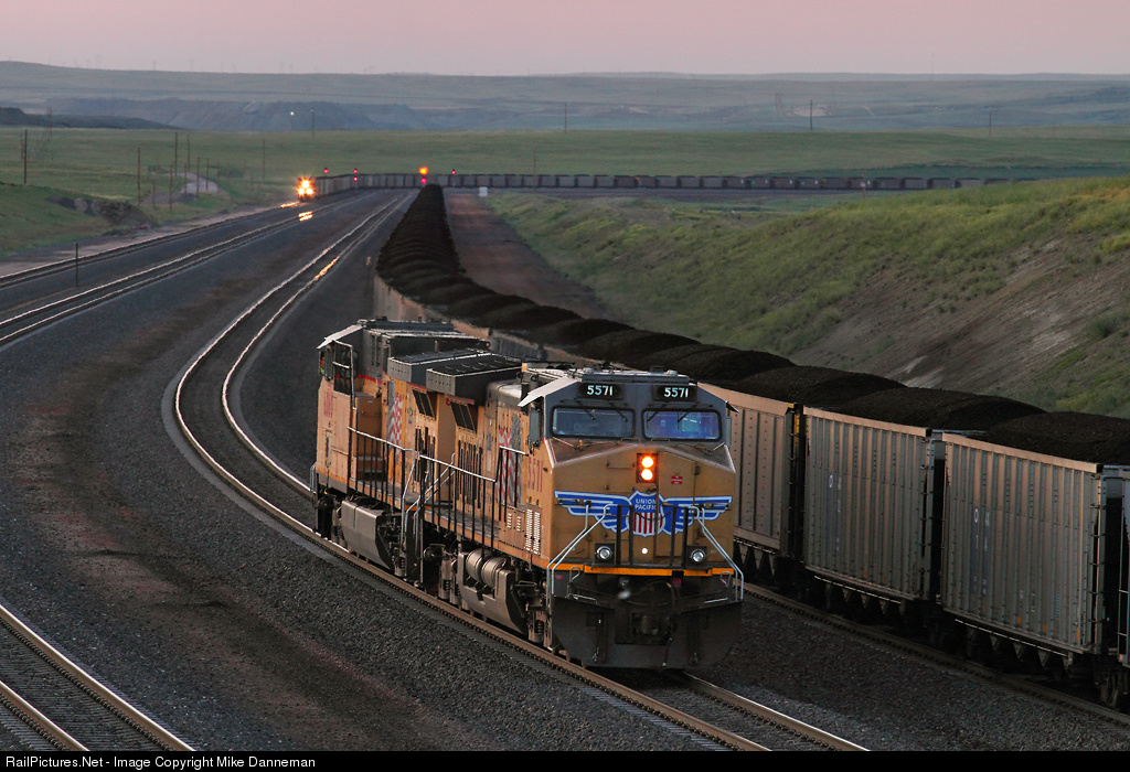 As an eastbound (southbound) Union Pacific coal train lumbers over the summit of Logan Hill on Track 1, a UP light engine move westbound cruises by on Track 2, while over on Track 4, an eastbound BNSF coal train climbs the grade toward the top. All this action takes place right at sunset on the busy Orin Line in Powder River Basin west (north) of Bill on June 18, 2015.