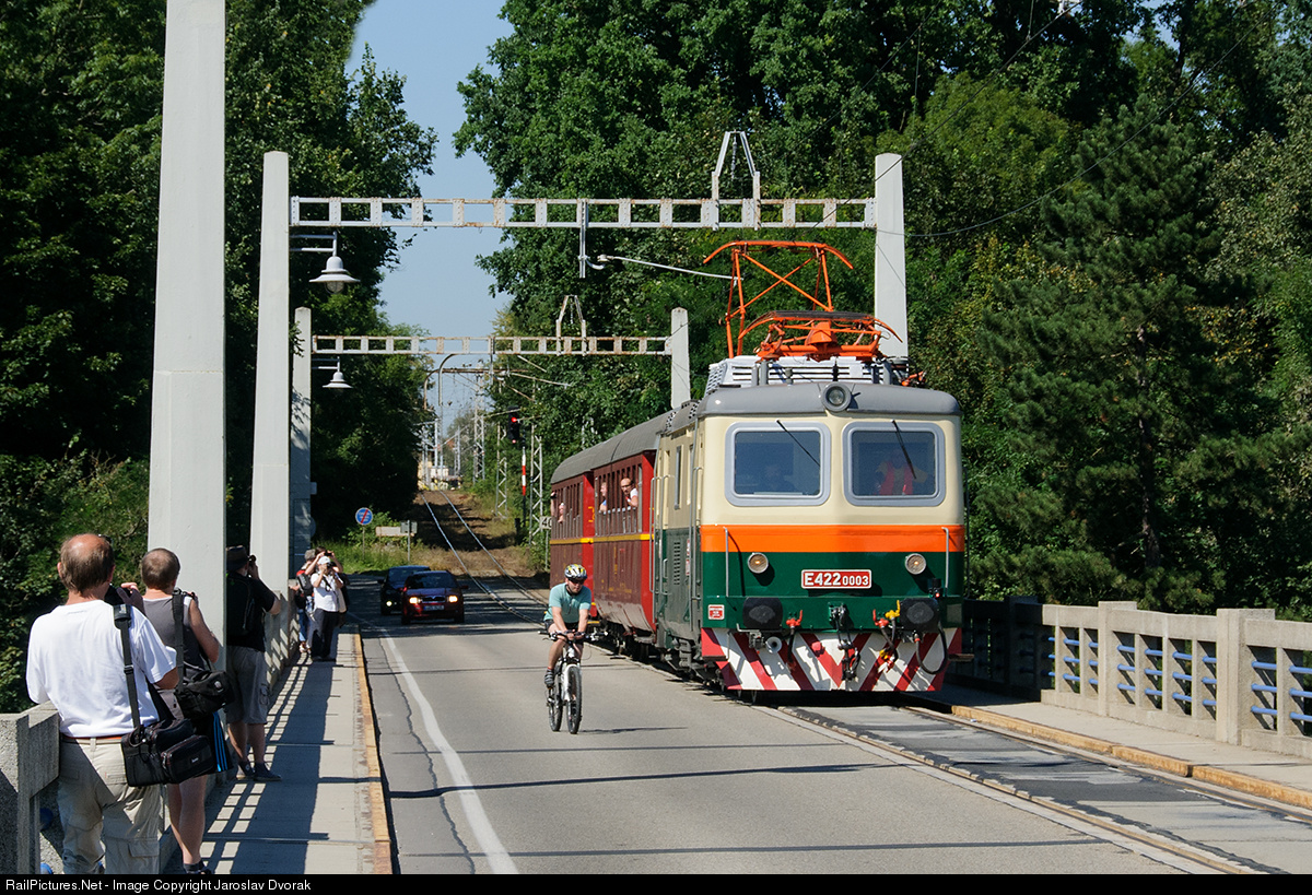 | Historical gem locomotive E4220003 "Bobinka" rides in the summer after our oldest electrified line Bechyne - Tabor (just crossed the bridge in Bechyně Rainbow). |