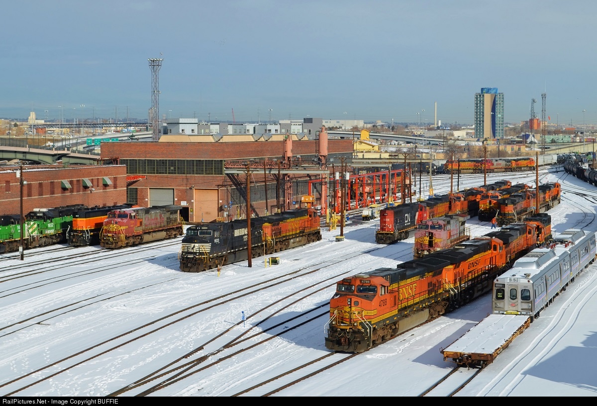 A couple visitors dropped in at the BNSF engine servicing facility in Denver, including Norfolk Southern 9533 (C40-9W) and Canadian National 5688 (SD75I). You can also spot some former AT&SF Warbonnets, Burlington Northern units, and a new Hyundai Eagle P3 commuter rail car in the yard.