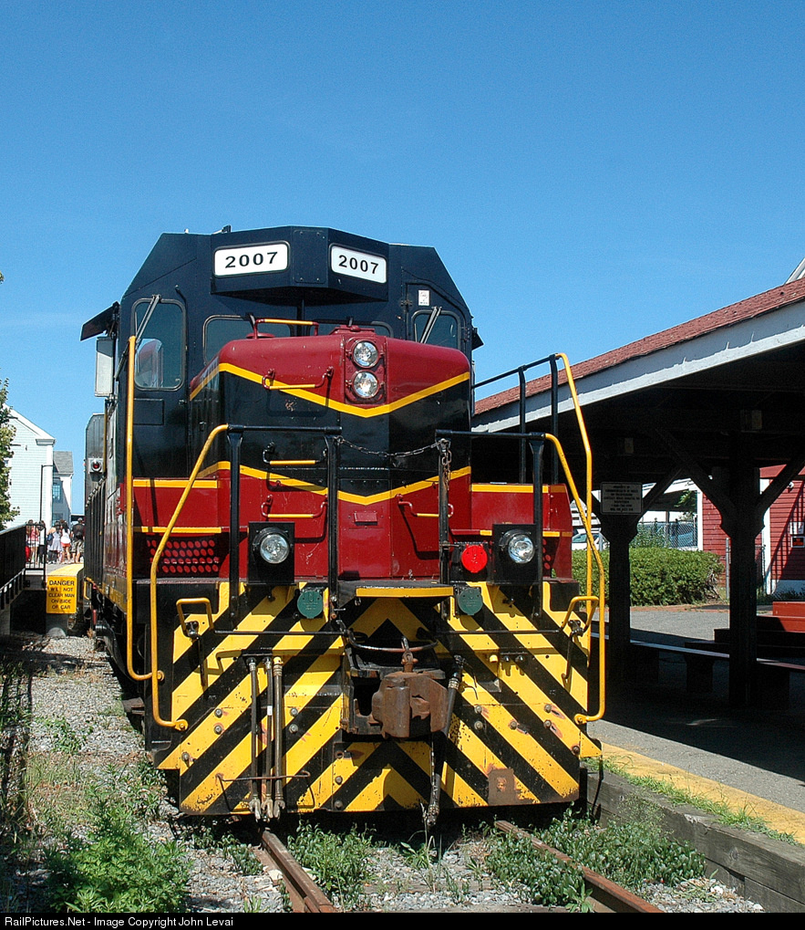 The afternoon Cape Cod Central RR excursion train pauses at the Hyannis station, with plenty of time until it's 2:30 departure. The GP7 will push it toward Sagamore and then lead it back to Hyannis. Right behind the GP7 is one of the former LIRR prototype bilevel coaches.