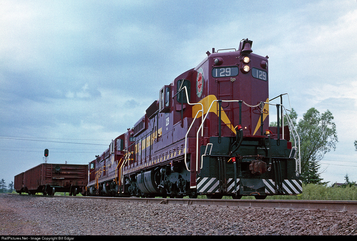 DMIR 129 restored to its original color scheme swtiches the tie plant at Bootleg, WI as part of its chores on the Interstate Branch freight. The train will work east to South Itasca before returning to Proctor, MN.