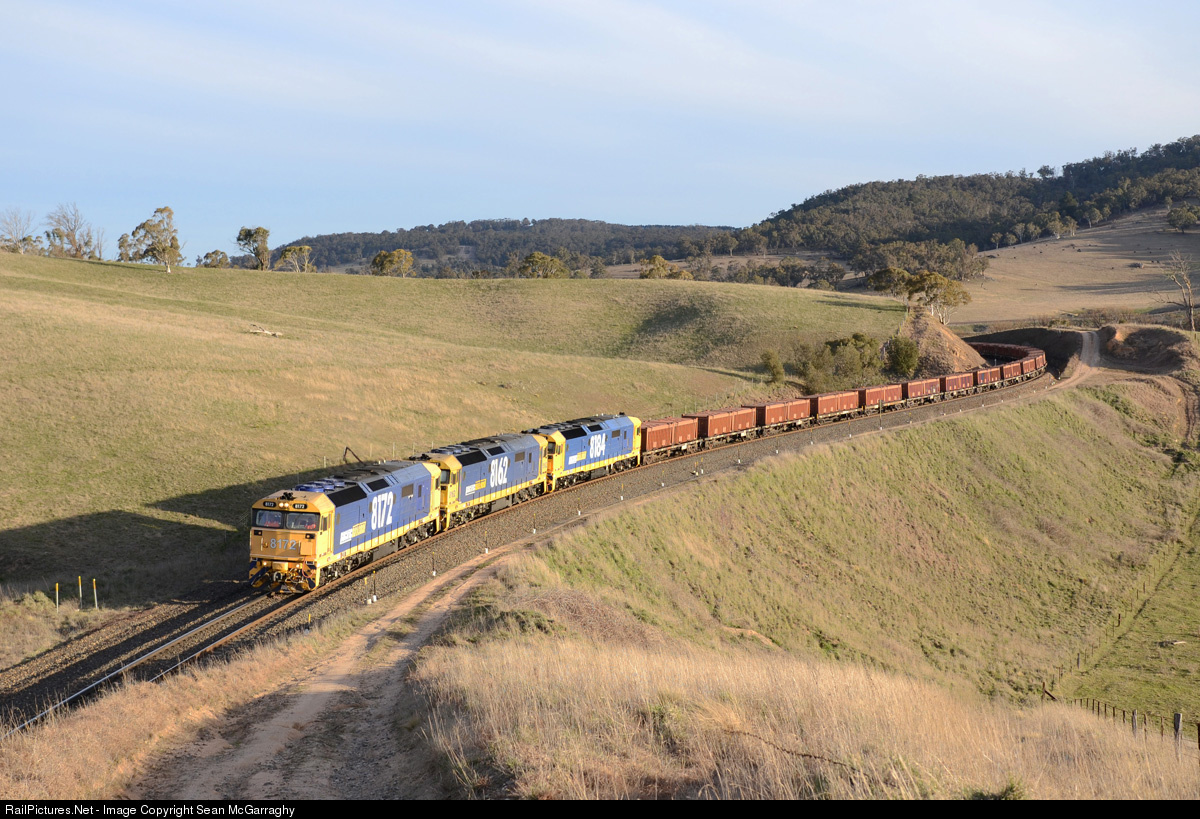 | With the PN contract to haul containerised ore out of Blayney to Port Kembla supposedly expired, and Qube Logistics set to take over the haulage task, 8172, 8162 & 8184 work 8934N loaded Blayney mud train through Sodwalls. |