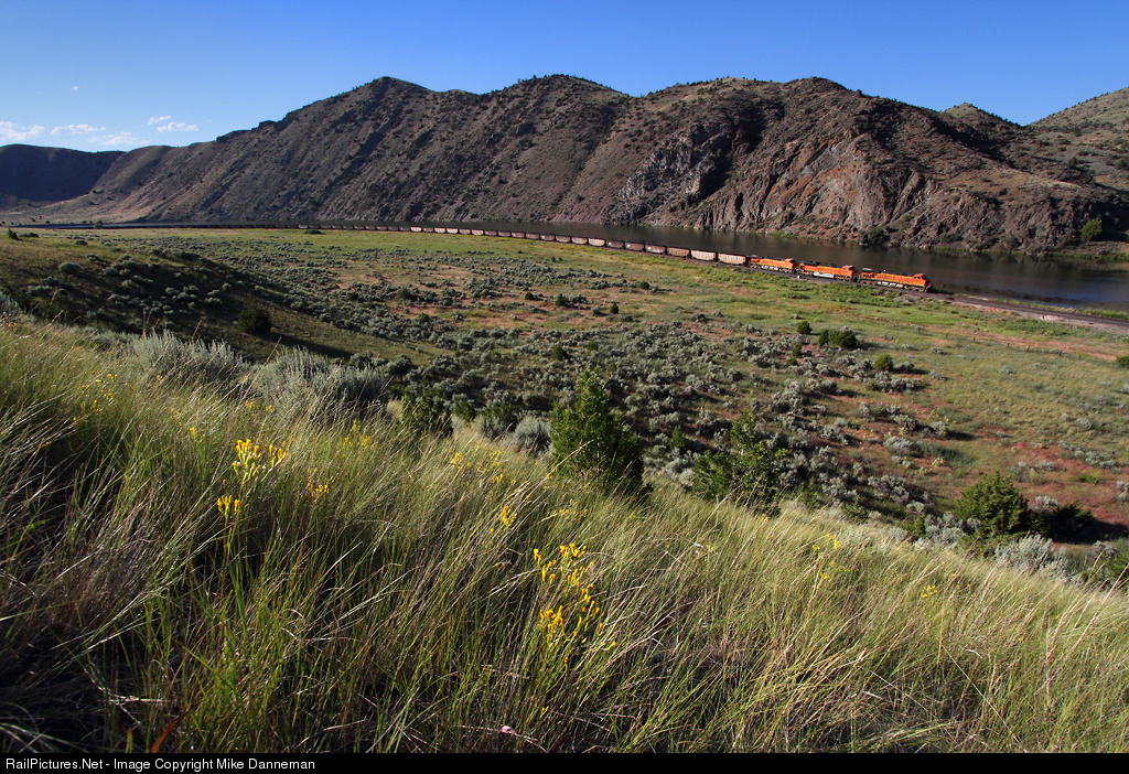 | A westbound BNSF coal train arcs along the Missouri River in Lombard Canyon east of Toston, Montana, on the afternoon of June 27, 2016. |