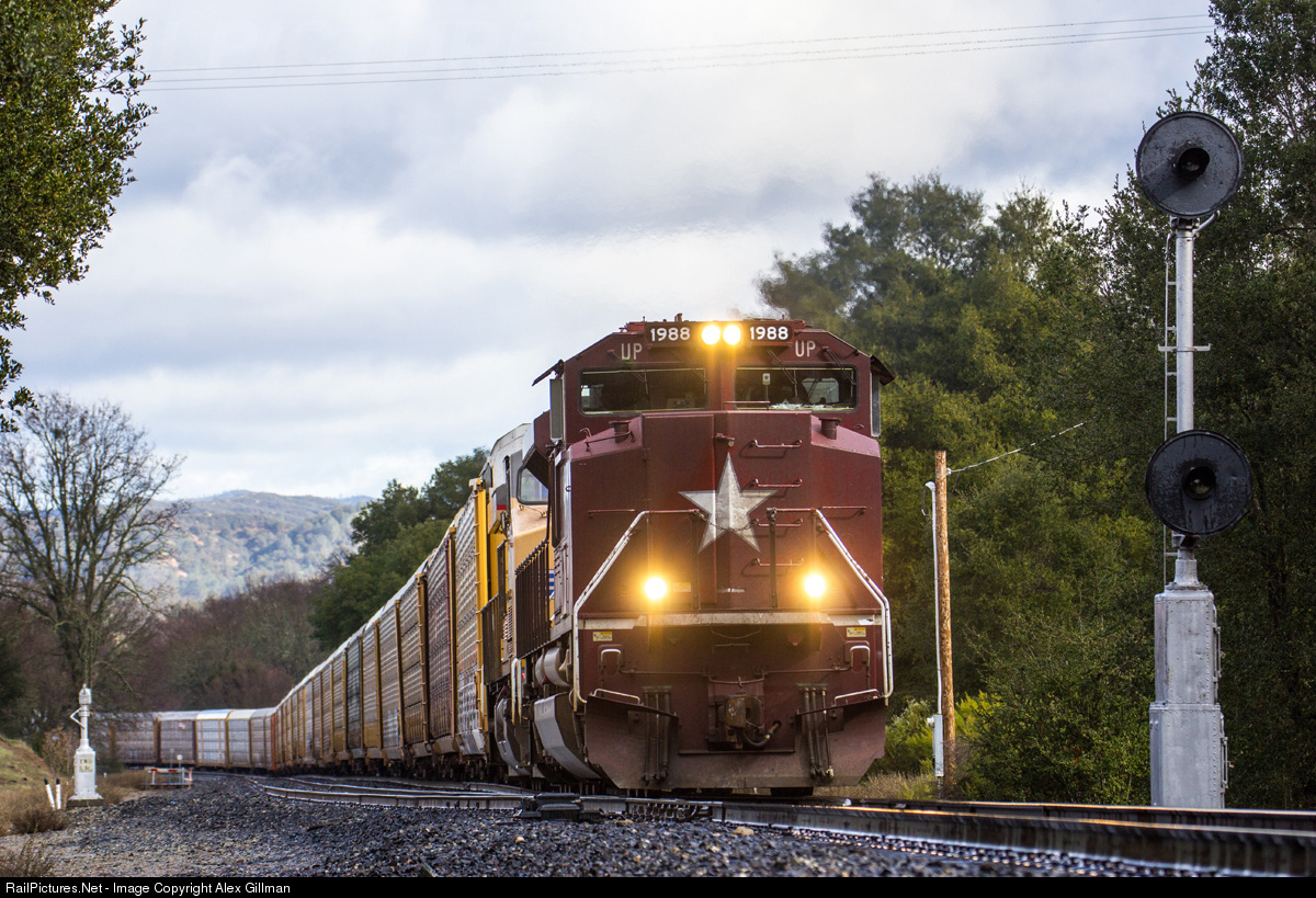 Battling upgrade on wet rails at the southern switch of Santa Margarita, UP 1988, the Missouri-Kansas-Texas Railroad heritage unit, leads an El Paso, Texas-bound autorack train toward the still active ex-Southern Pacific searchlights here.