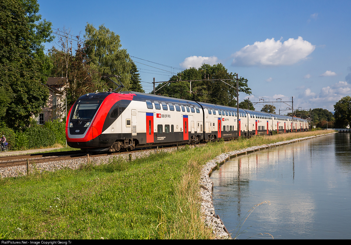 After brake test runs between Sulgen and Romanshorn, the future doubledeck Intercity train for the SBB, RABe 502 # 203, is on the return journey to Zürich Herdern, along the work canal at Bürglen. This trains, ordered in june 2010 from Bombardier Transportation, are more then 3 years behind delivery schedule now.