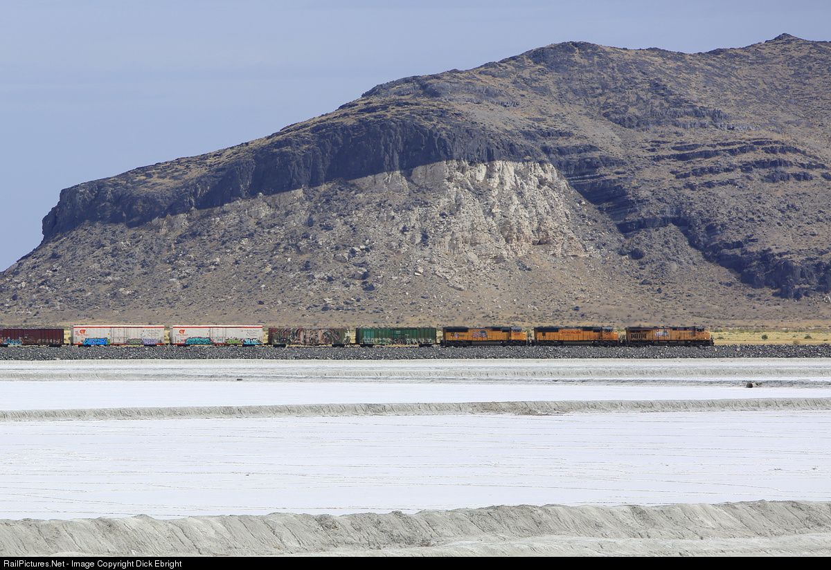 | Union Pacific's 7679 east is just about finished with its trip across seemingly endless mud flats and salt pans of the Great Salt Lake Desert as it approaches Lakeside, Utah. The last 58 miles from Lucin to Lakeside have been nearly dead level and curveless. The beginning of the Lakeside siding is only a little over a mile away and then it's out to sea on the Rambo Fill to Promontory Point. Those brilliant white salt evaporation pans in the foreground and rugged Strong's Knob behind the train are landmarks on the Lakeside Sub. |