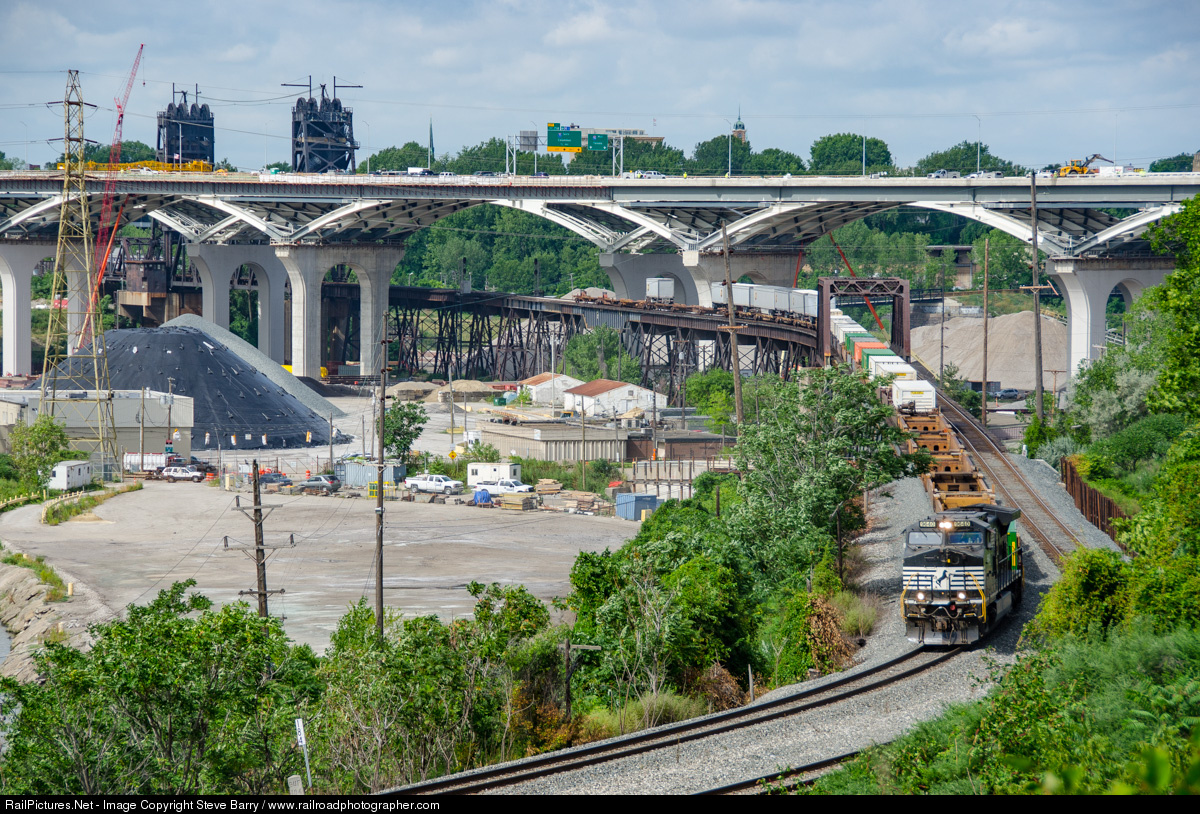 A Norfolk Southern freight rolls east coming off the former Nickel Plate Road bridge over the Cuyahoga River.
