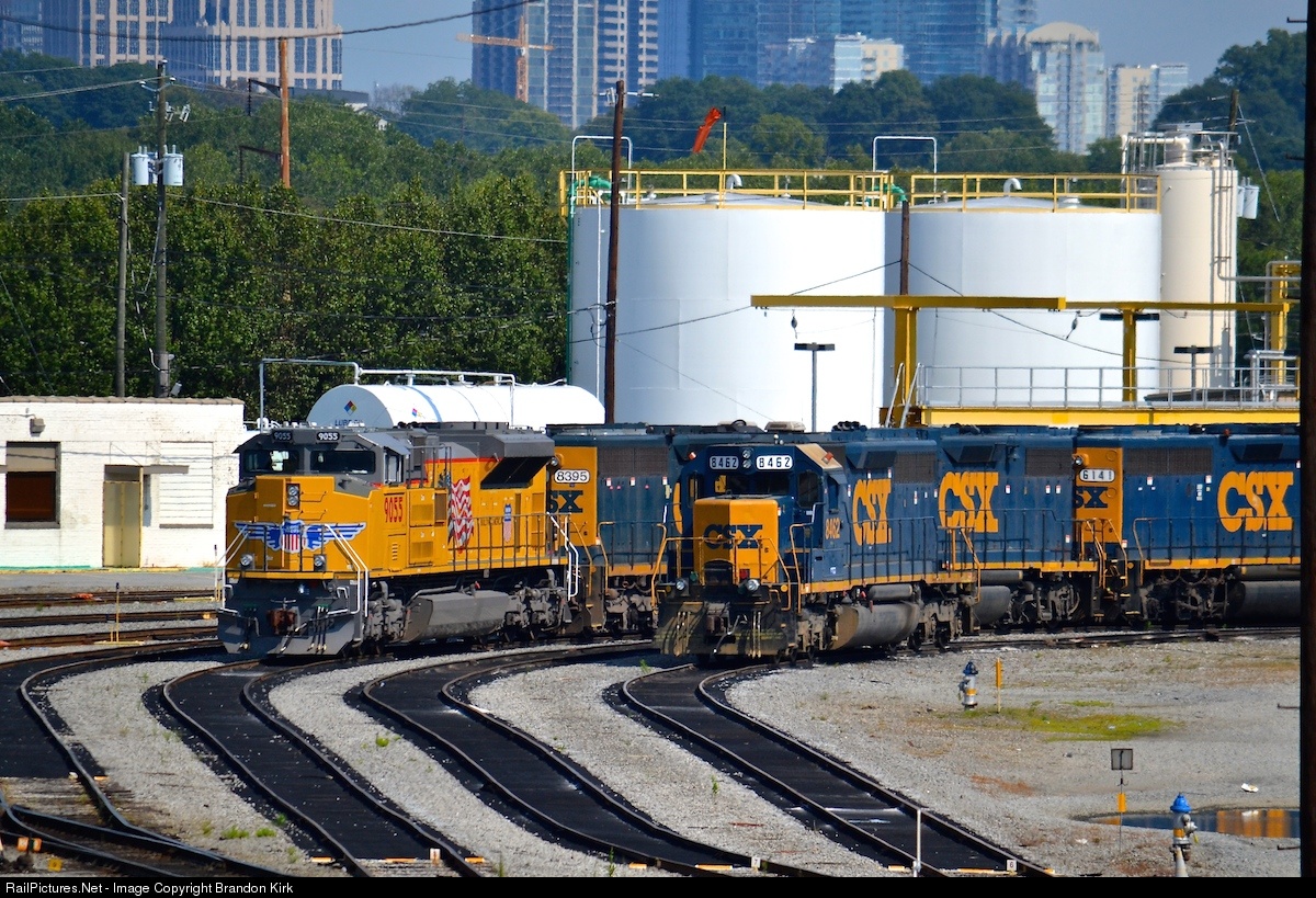 | As far as I can see, there's all EMD power at the Diesel shop in CSX's Tilford Yard. Foreign power in the form of a shiny new Union Pacific EMD SD70AH, sticks out in a sea of blue and gold CSX engines. |