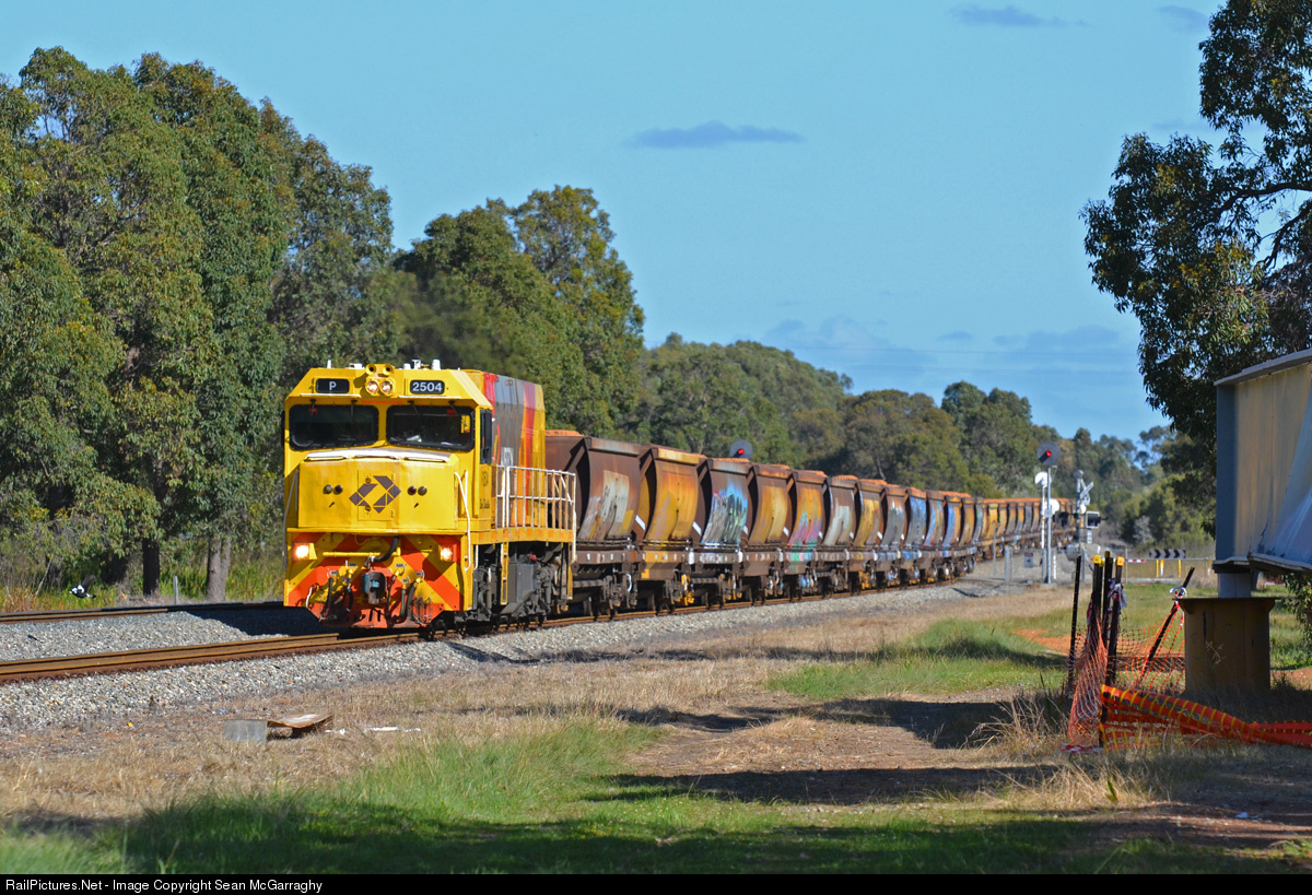 Rumbling through Mundijong, P2504 works 1932 extra rake of loaded bauxite from Calcine to Kwinana for Alcoa using the hired XG coal hoppers from Verve Energy.