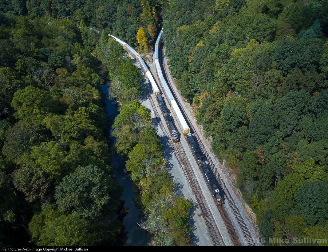 Eastbound rack train 272 darts out of Coopers Tunnel just a few short miles from the once busy yard at Bluefield, passing train 83K and their train of previously stored autoracks that have "held the main" on the once busy Bluestone Branch for the past year. Having been idle since the 80's, the line is now used for car storage during traffic downturns as far as Coopers Trestle just over the hill.