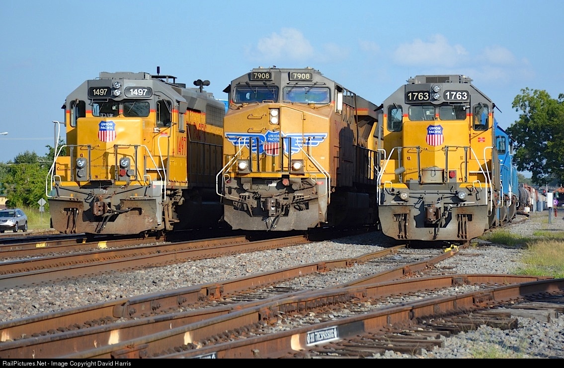 For years, leased GPs dominated the local power pool in Russellville. First came a horde of reddish/purpleish locos, which were supplanted by a flock of blue units. Today there were still three blue leaser GP38s in the yard, but also present were UP SD40N 1763 (history unknown) and UP GP40M-2 1497 (a Western Pacific unit built in 1971, which later wore SP and Gateway Western colors). Sliding down the main with a nb manifest, ES44AC 7908 splits the old EMDs to complete the UP portrait.