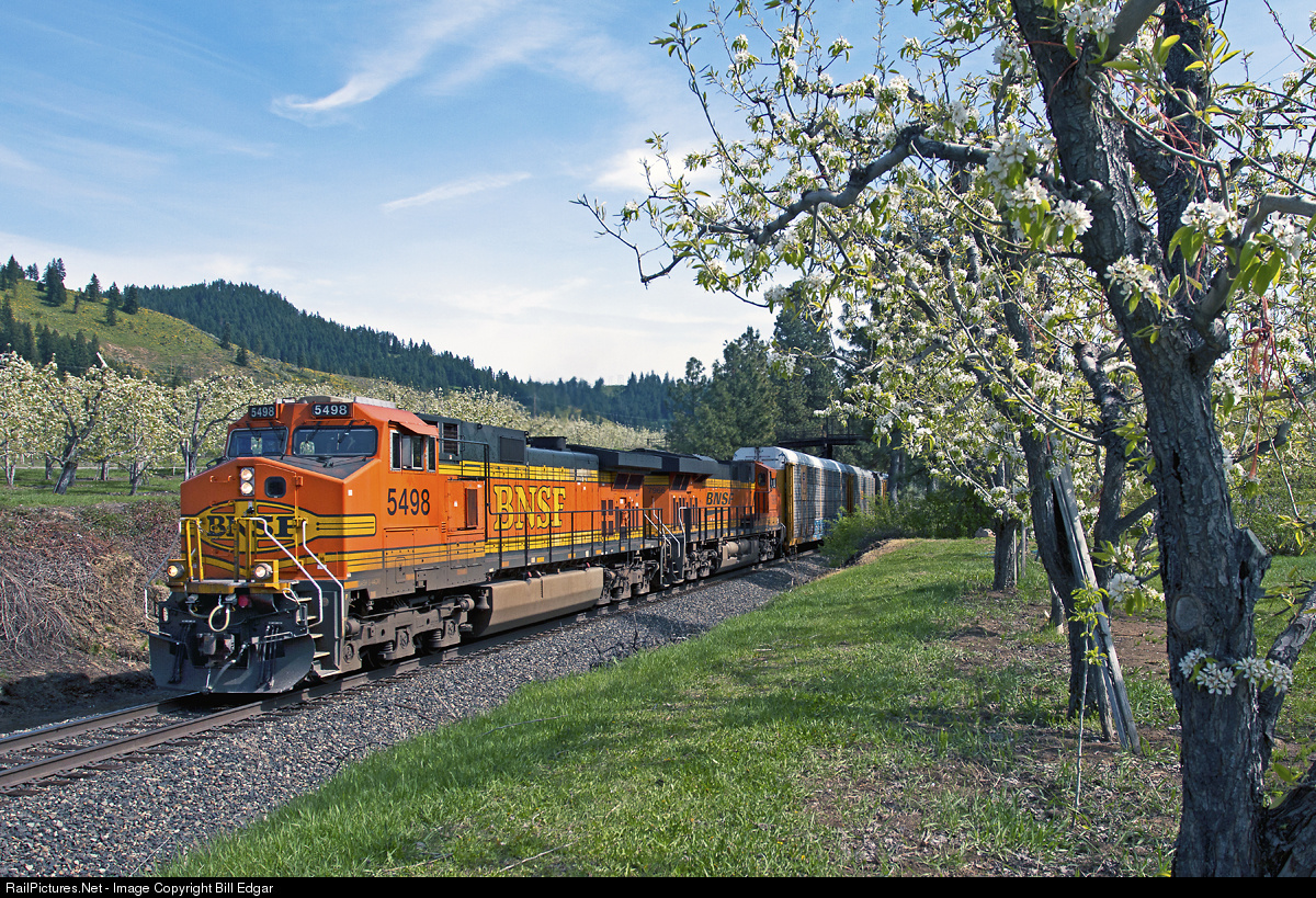 | BNSF 5498 heads a vehicle train west through apple blossoms just west of Peshastin, WA, tucking under a vintage wood bridge used to reach orchard property near the Wenatchee River. |