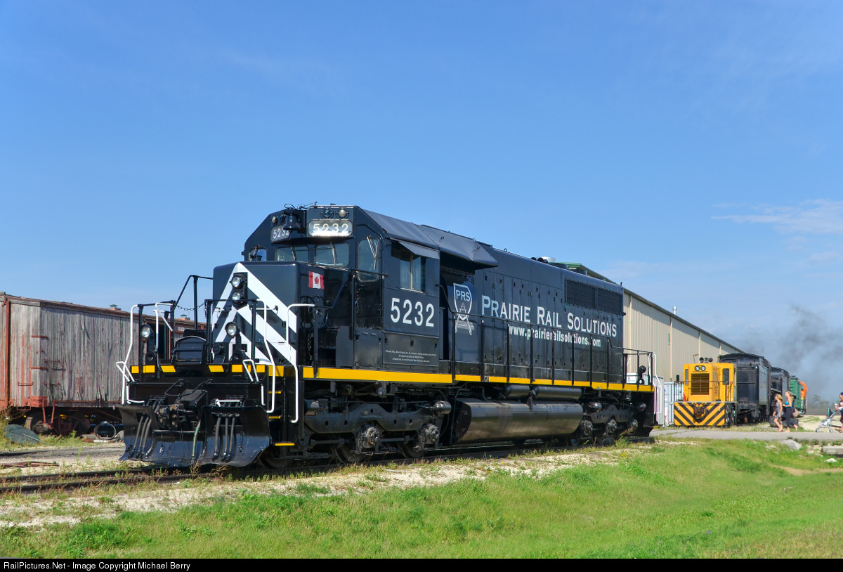 A freshly repainted SD40. VLSX 5232 may be the only 'straight' ex-CN SD40 still in service. It was repainted out of its faded zebra stripes during the past couple of months and sports a paint scheme very similar to that worn by SD40's on the New Brunswick East Coast not too long ago. Here it sits in the morning sun in the small Prairie Dog Central yard at Inkster Junction. Steam from 4-4-0 PDC 3 is visible in the background, it will leave with an excursion train in not too long, with passengers arriving to board the train.