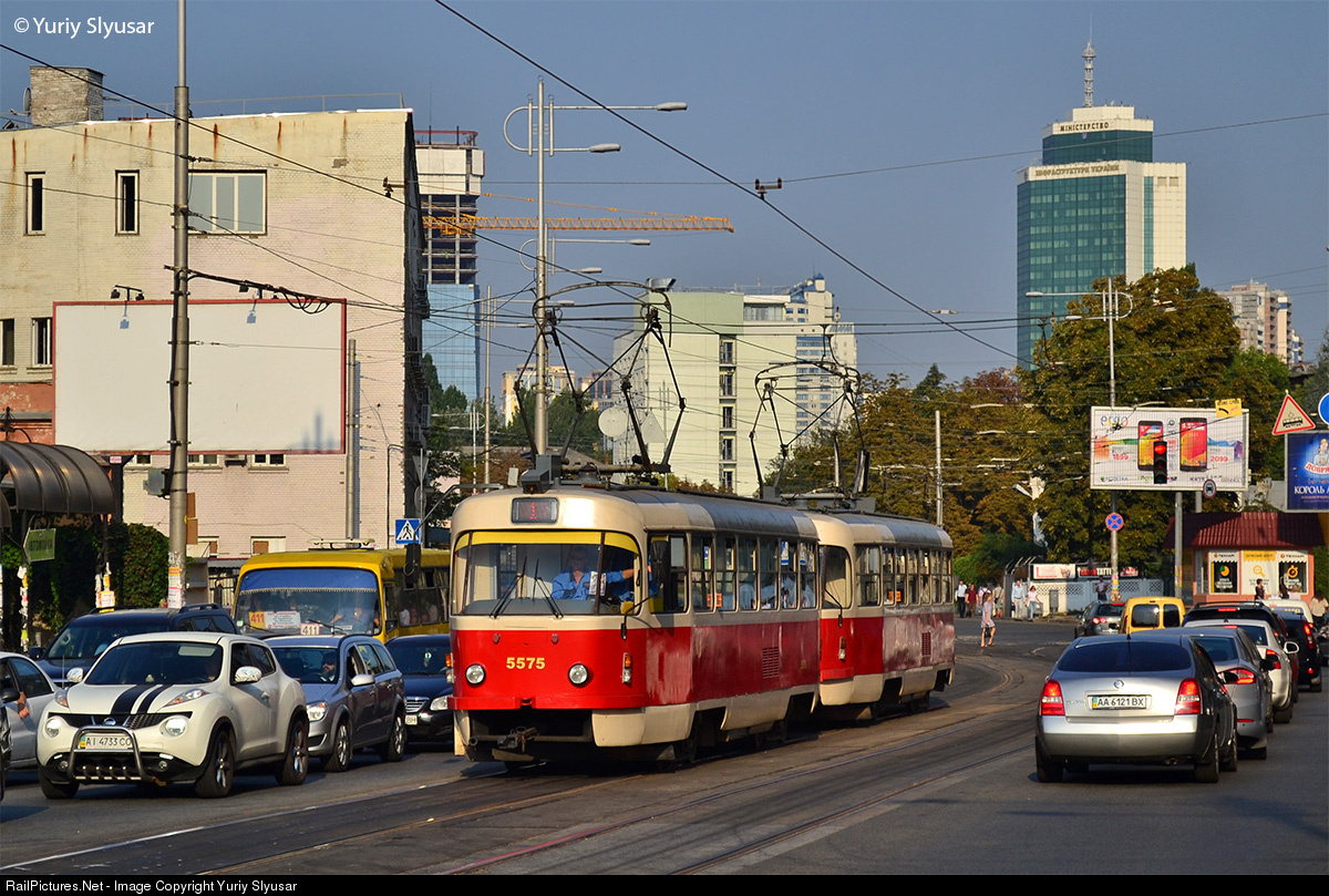 Tramways Tatra T3SUCS #5575+5576 going on the route #1 Mykhailivs'ka Borshyagivka - Starovokzal'na street. This tramway Tatra T3SUCS #5575 built by ČKD-Praha in 1987, and