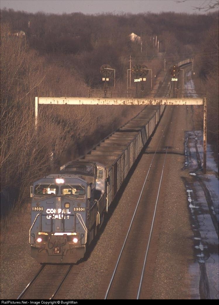 Late day sun hits the nose of this empty hopper train running west past the signal at MP 321 on the Pittsburgh Line