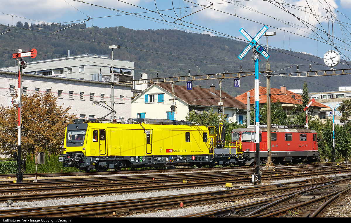 The newest SBB vehicle and the oldest signals. Self propelled dual power (electric/diesel-electric) EHFZ (Erhaltungsfahrzeug/maintenance vehicle) for the Gotthard Base Tunnel, Xem 181 # 011, together with Re 4/4 II # 11144, is leaving Biel RB (shunting yard) to Solothurn on a test run. In Biel RB, the last and only, wire operated, mechanical signals (semaphors and shunting signals) of the SBB are still in daily use. 13 of this yellow Xem vehicles for the maintenance of the Gotthard and Ceneri Base Tunnels will be delivered by Harsco Rail (a US company) from Germany.