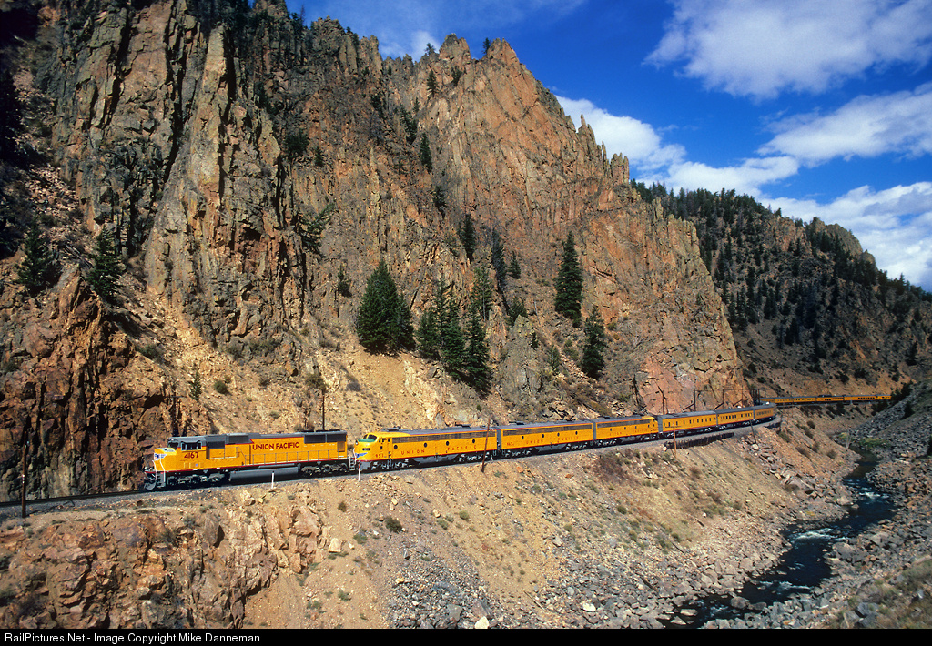 Traveling westbound through scenic Byers Canyon west of Sulphur, Colorado, on September 28, 2000, is a Union Pacific Board of Directors train heads powered by new EMD SD70M No. 4167 and three E9s.