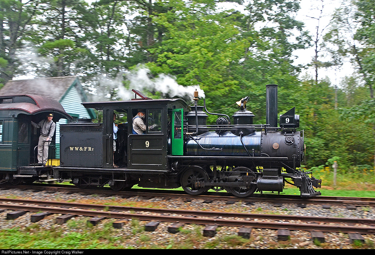 Wiscasset, Waterville & Farmington #9, a 24" gauge 0-4-4, recently completed an extensive rebuild that lasted nearly a decade. This little steam engine is showing off as a result, with a high-speed run-by at Alna Center, at about the halfway mark on the museum's line. This engine was one of ten two-foot-gauge locomotives built by Portland Company (of Portland, Maine). Constructed in 1891 as Sandy River Railroad #5, it became Sandy River & Rangeley Lakes #6 in 1908. In 1924, this locomotive acquired a new number yet again, when it became Kennebec Central #4. It was sold once again, to its fourth owner, in 1933, as Wiscasset, Waterville & Farmington #9 - the image it carries today - 125 years after it was built.