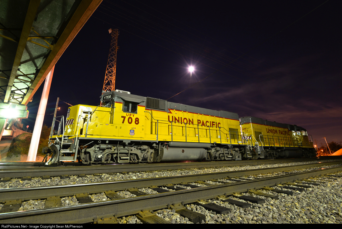 | A pair of recently overhauled GP15's rest in the moonlight at Waukegan. A rather common sight here, these units are utilized for switching the yard and nearby power plant, as well as powering the area's locals on UP's ex-CNW freight lines from Wisconsin. |