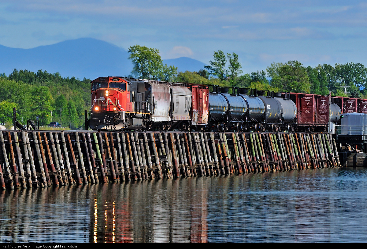 St Albans to Montreal Qc Canadian National #323 eases across the trestle at the entrance to Missisquoi Bay( Lake Champlain) on a breezy September afternoon.