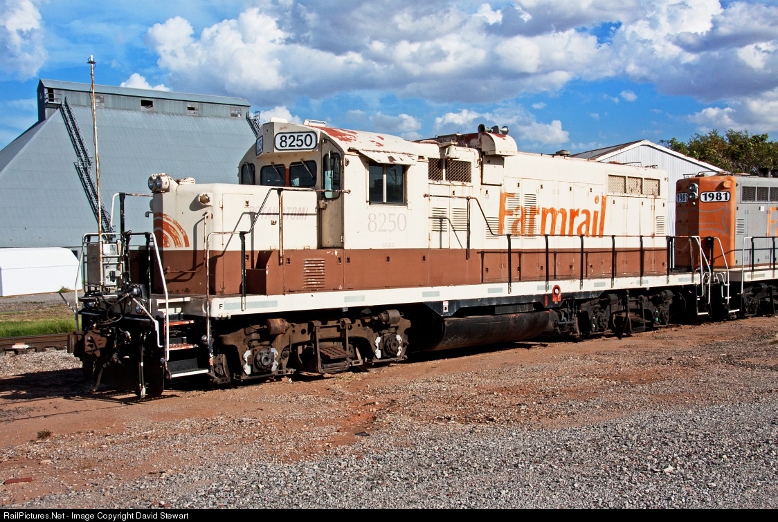 | Grainbelt/Farmrail Paducah built GP10 NÂș8250 sits out the rest of the day in Clinton, Oklahoma after a hard day of RC switching. The unit's RC gear rest on the front drop step which can be applied to most any engine with a few small modifications to the train line air. |