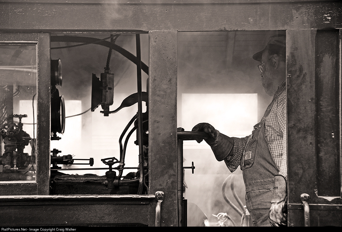 ... but it also takes a human to make a locomotive come "alive" and do what it was designed to do. As steam swirls around and through the cab on a cool and moist morning, the engineer of Wiscasset, Waterville & Farmington 0-4-4 #9 prepares his machine for the first passenger run of the day. Shortly, the engineer will move his locomotive to get it loaded with coal, pick up its two-car train, and then position it under the water tank so his fireman can fill the tank with water to boil. (Alna, Maine - September 11, 2016)