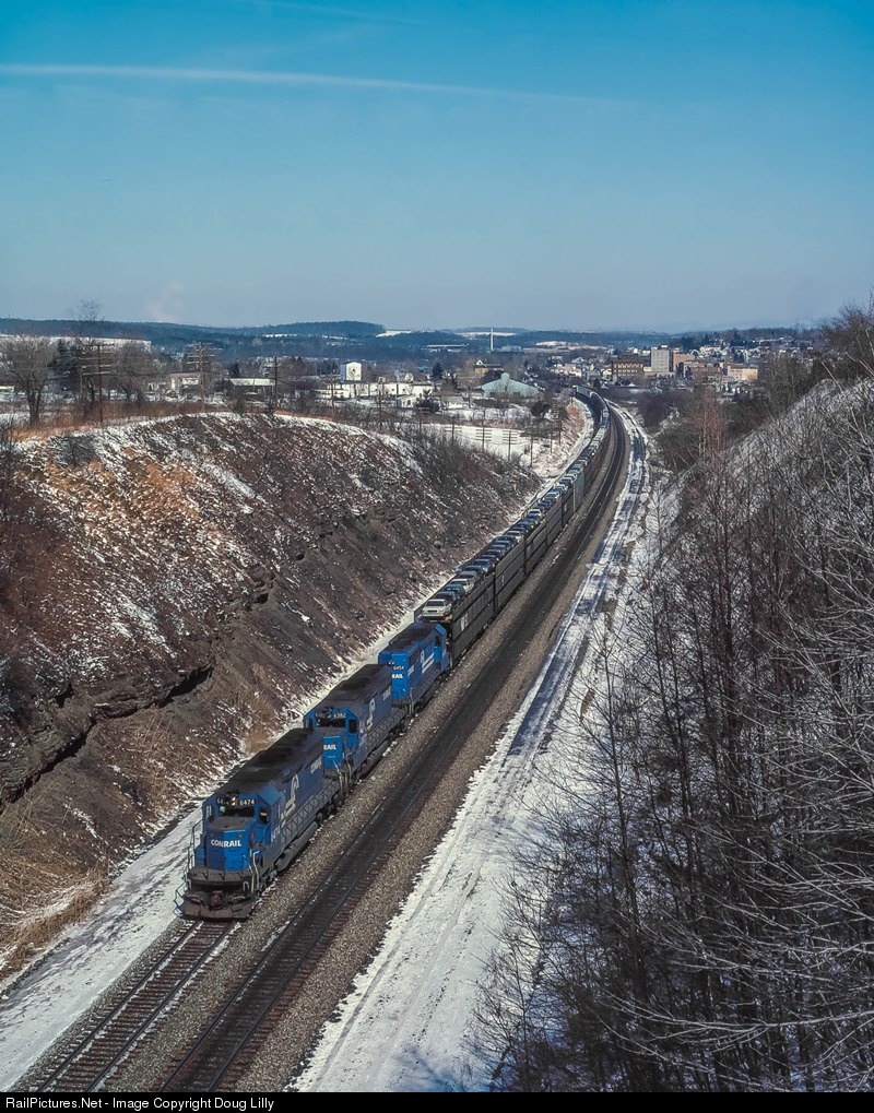 Passing through the land of Arnold Palmer’s old tractor and Rolling Rock beer, three Conrail SD40-2-s enter the rock cut west of Latrobe, Pennsylvania with a mixed consist. The auto racks are carrying those icons of 1980’s automotive technology, Chrysler K-cars.