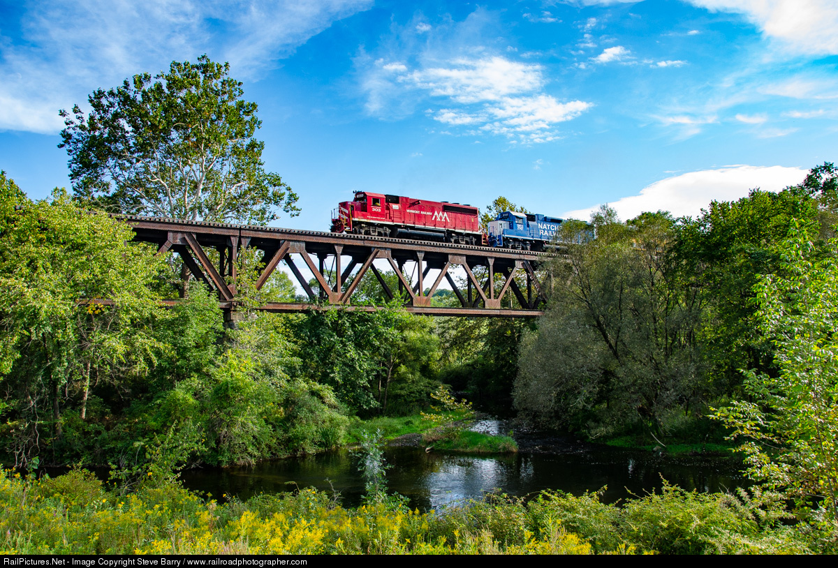 Vermont Railway No. 303 leads a train of interchange cars from Pan Am Railways over the Walloomsac River on its way to North Bennington and on to Rutland, Vt. Normally Pan Am would go to North Bennington for the interchange, but on this day the Vermont Railway had to retrieve its own cars from Hoosick Junction, N.Y.