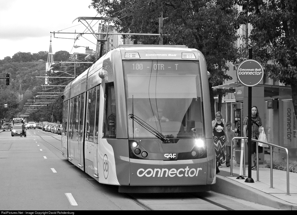 | One of the new Cincinnati Street Cars, now called the "Cincinnati Bell Connector", makes a station stop at the Washington Park Station on Race Street. |
