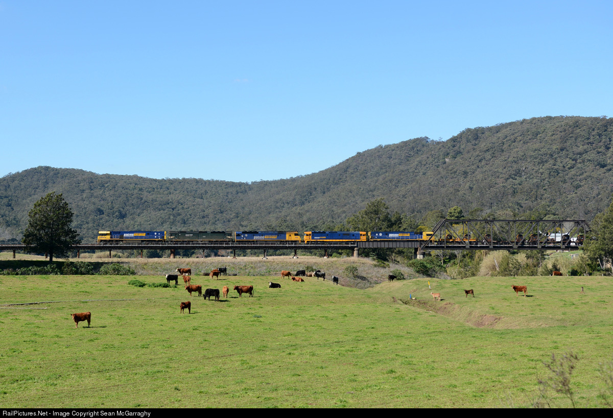 1WB3 Pacific National steel train pulls out of Paterson and crosses the Paterson River rail bridge with an impressive combo of NR95, G538, AN6, 8120 & NR119 en route from Port Kembla to Brisbane.