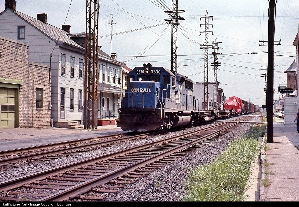 A single GP40-2 leads a short westbound freight by the row homes along Scull Street. In 1980, when this photo was taken, track speed was 25 mph and trains sounded their bell only; it was a "semi-quiet zone." Today, track speed is 40 mph and trains sound their horns at all crossings. One of the homes pictured is currently for sale at $38,900. Gannon Street crossing (between the 1st and 2nd flatcars) is closed, and the old Railroad House bar/restaurant on the right is closed. The last Reading RR passenger train (The Queen of the Valley) stopped at the station in the right background in June, 1963.