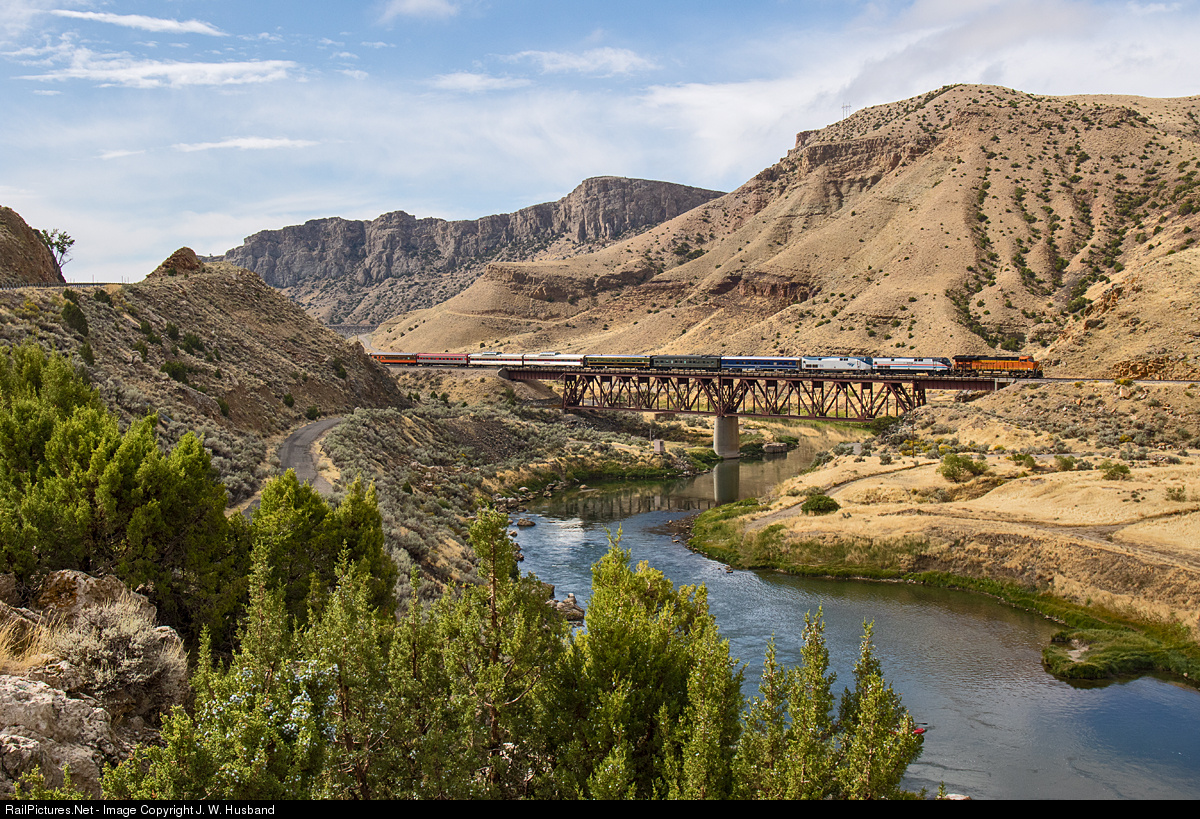 Crossing the Big Horn River on BNSF's Casper Subdivision, the annual AAPRCO special enters the spectacular Wind River Canyon as it heads north toward its destination for the day at Livingston, MT. BNSF provided a unit as protection power for the run from Casper to Greybull, WY.