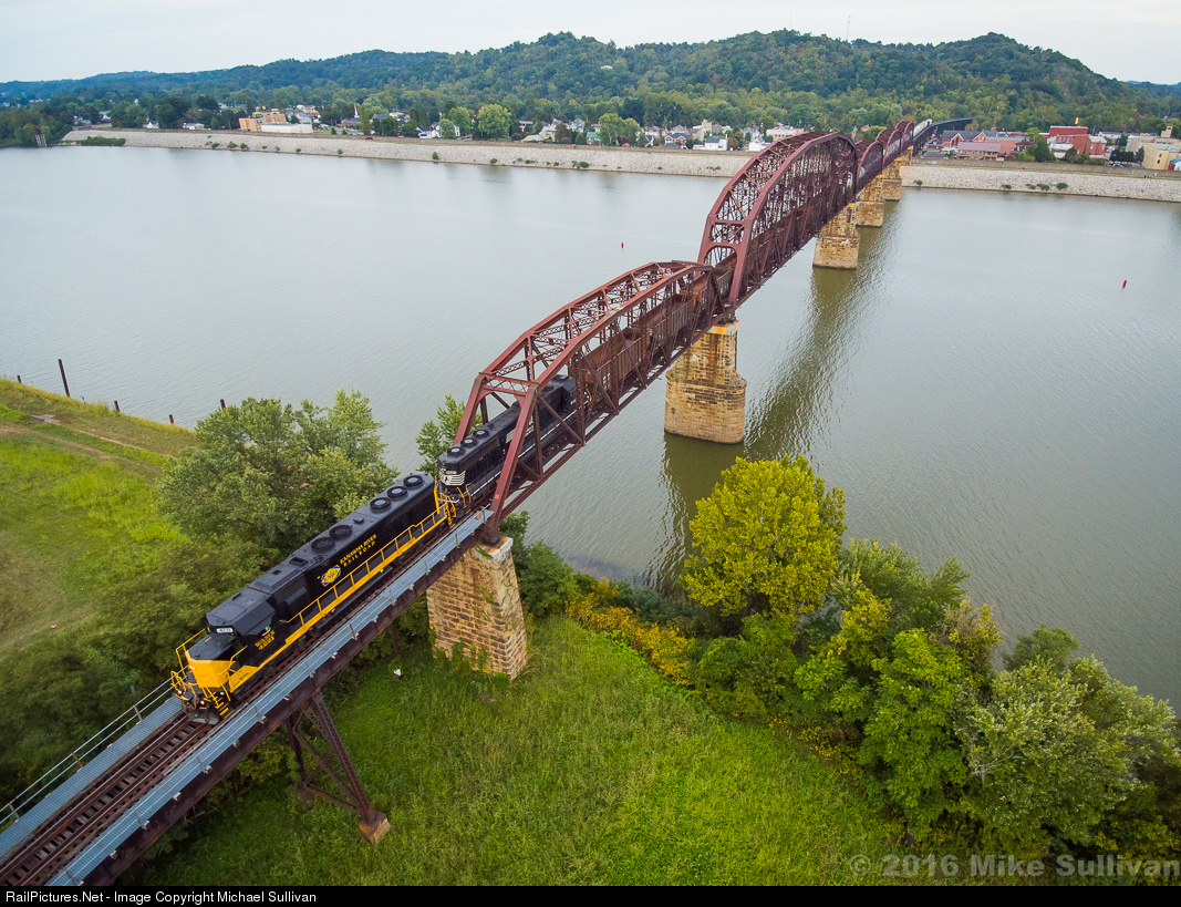 | A minute after this shot was taken, Kanawha River Railroad's Dickinson to Columbus manifest 381 is crossing the single track bridge from Point Pleasant and is officially crossing into Ohio with a Watco SD40-2 and leased NS SD60 for power. In a few short minutes, the train will enter CSX trackage on the former Pomeroy Sub for the last few miles of this crew's run to Hobson Yard, near Pomeroy. |