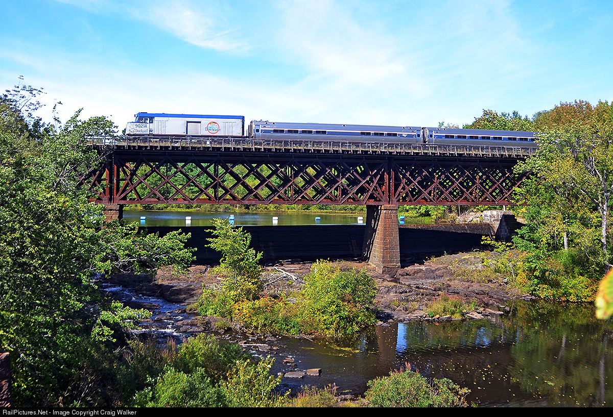 Amtrak's northbound Downeaster, train number 693 (Boston MA to Portland ME) crosses from New Hampshire into Maine as it crosses the Salmon Falls River, which is the boundary between the two states. Amtrak P42DC 22 is on the head-end, and Non-Powered Control Unit 90214 is on the rear. NPCUs are former F40PH diesels, with the prime mover removed and a baggage compartment added. Note that 90214 has had the white Scotchlite Downeaster lettering replaced with much more legible blue lettering. The Salmon Falls River, as with all rivers in the Northeast, is running low due to a drought in the region.