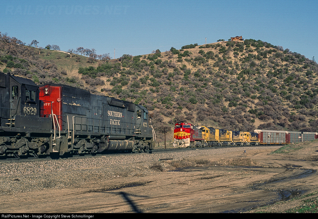 Early in the morning, an SP light helper waiting at the west end of Cable meets Santa Fe 526 West, a hot vehicle train.