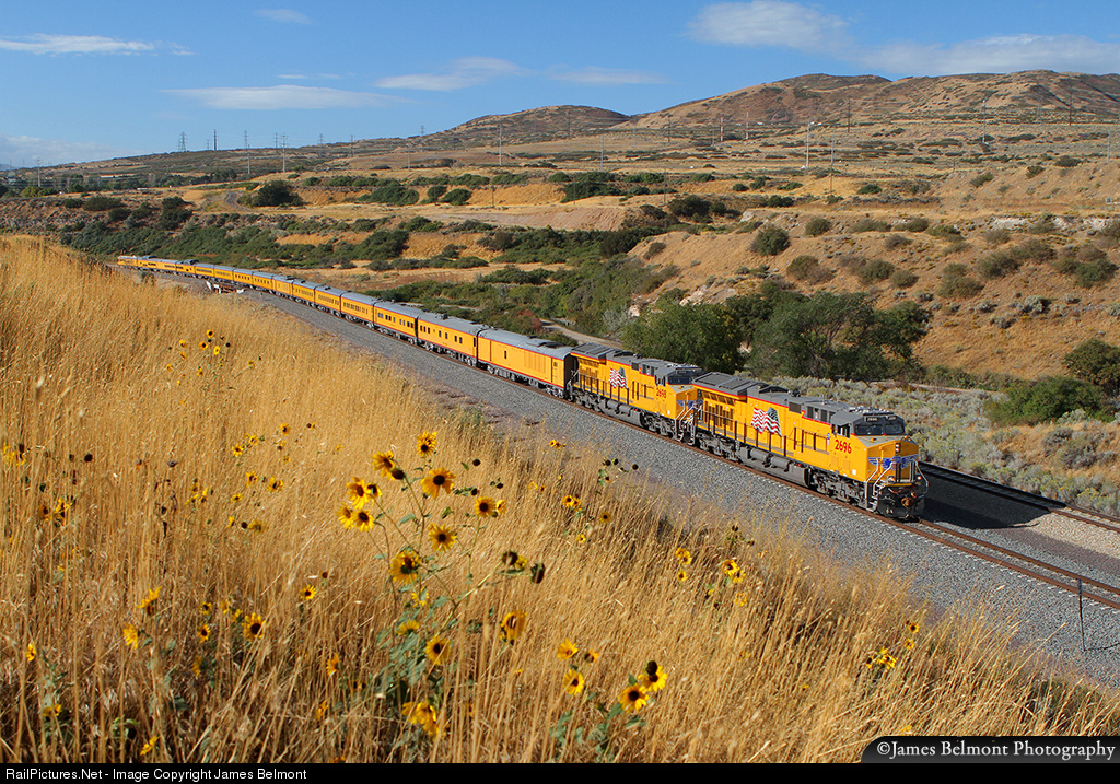 A Union Pacific Grand Junction, Colorado to Salt Lake City, Utah passenger special rolls through the Jordan Narrows west of Mesa siding on a sunny Sept. 14, 2016 morning.