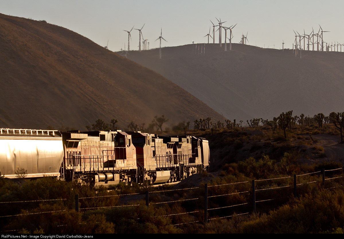 Locked in a battle with gravity, a 120 car loaded grain train works up the southern slope of Tehachapi Pass the fading sunlight dips behind wind milled covered hills. These 100 plus car long grain train get added help over the mountainous tracks around the south western region of the United States. At Gallup, three mid train DPUs and two rear DPUs are add to the train' making the power configuration 4x3x2. This helps the train to move over the mountain grades of the Arizona Divide (7,335 ft), Ash Hill (2,100 ft), and Tehachapi Pass (3,600 ft).