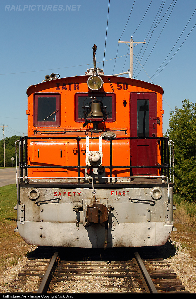 | Iowa Traction RR IATR 50 is tied down at Mason City on the main outside the UP interlocking. IATR built for the Washington & Old Dominion in 1920 and spent time on the Cedar Rapids & Iowa City and the Kansas City Kaw Valley & Western RR before coming to Mason City. |